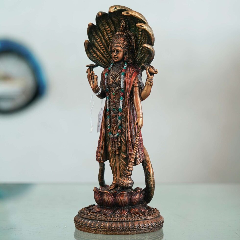 A Lord Vishnu idol is a sacred representation of the Hindu deity Vishnu, the preserver and protector of dharma (righteousness). He is often depicted in a standing posture, holding four symbolic objects: Size: 12.7×12.7×31.5cms